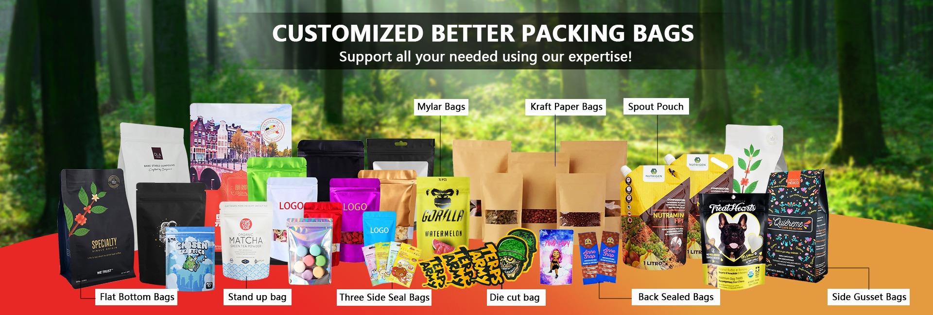 Prodotti principali: Borsa a fondo piatto, borsa da boxe con cerniera, sacchetto di plastica per beccuccio, sacchetto di Mylar, sacchetto di carta Kraft